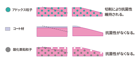 表面コートでは、義歯調整などで表面を切削することで、コートしたものが無くなってしまいます。抗菌性のある静菌AD-PSJ(アドックス粒子)を混入することで、新たな切削面に静菌AD-PSJ(アドックス粒子)が存在していることで、切削しても効果を持続できます。