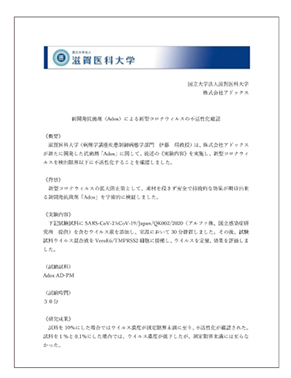 滋賀医科大学でプレス発表「新開発抗菌剤(Adox)による新型コロナウィルスの不活性化確認」